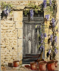 Le tableau révèle une scène romantique où une luxuriante vigne de glycine s’étend délicatement sur un vieux mur de pierres, créant une explosion de couleur et de douceur.