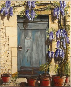 Au centre de cette scène, une porte en bois, sobre et élégante, se cache partiellement sous les cascades de glycine.