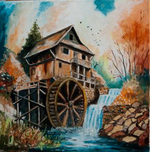 Ce tableau représente un charmant moulin à eau niché dans un paysage naturel vibrant. La structure principale du moulin, en bois et légèrement patinée par le temps, domine la scène avec sa grande roue en bois actionnée par une cascade d’eau cristalline. L’eau qui s’écoule, vive et dynamique, ajoute une sensation de mouvement et de vitalité à l’œuvre.