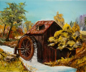 Le tableau représente un moulin à eau ancien, accolé à une grande maison en bois, nichée au bord d’une chute d’eau à deux niveaux. Le moulin, avec sa roue imposante, tourne lentement sous l’effet du courant, l’eau s’écoulant en cascade autour de ses pales en bois usé. La grande maison en bois, aux murs patinés par le temps, présente une architecture rustique. Le paysage environnant est verdoyant, avec des arbres et des herbes hautes qui bordent la rivière, créant une atmosphère tranquille et intemporelle. L’ensemble évoque une harmonie parfaite entre l’homme et la nature, où l’eau et le bois coexistent en équilibre, témoignant d’une époque où la vie s’écoulait au rythme des saisons et du murmure de la rivière.