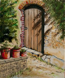 L’atmosphère dégagée par le tableau est celle d’une ruelle secrète, calme et accueillante, où le temps semble s’être arrêté, permettant aux couleurs des fleurs et de la pierre de se fondre harmonieusement dans un tout paisible.